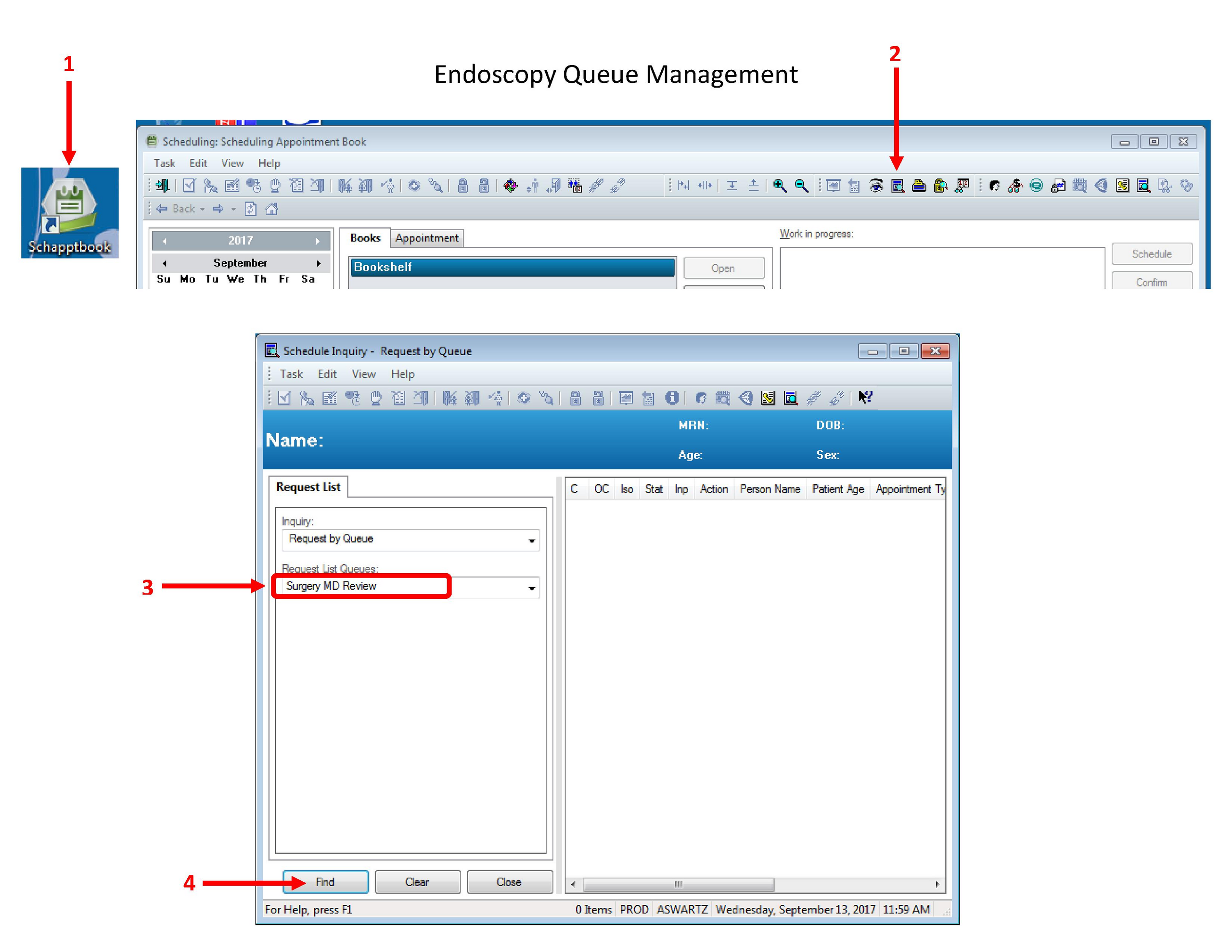 The steps for opening the Endoscopy MD Review queue.