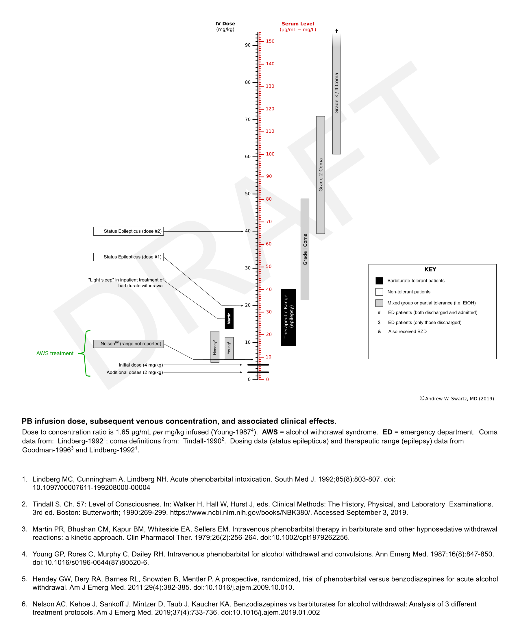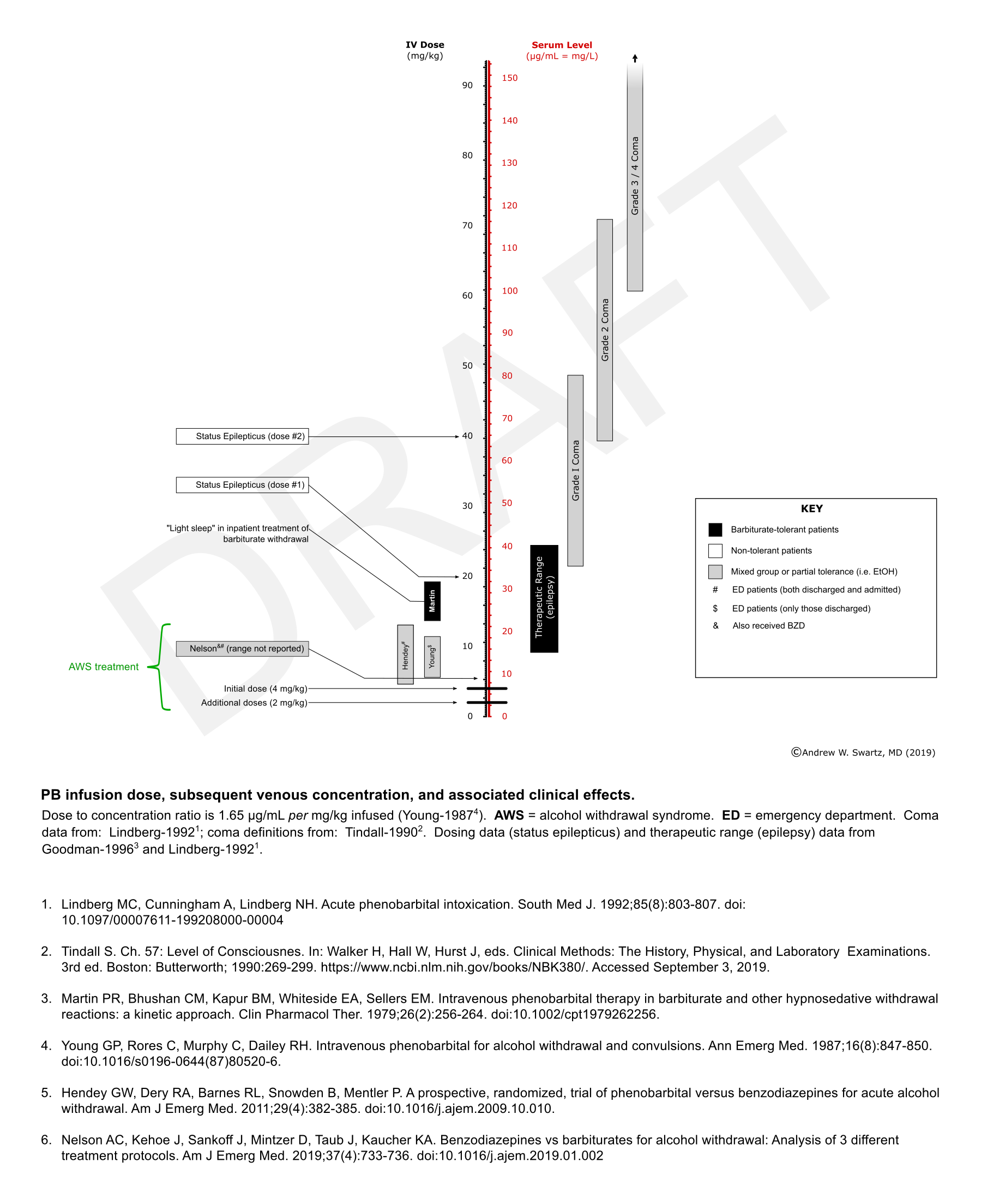 Infused weight-based dose of phenobabital with associated serum levels clinical effects. Copyright: Andrew W. Swartz, MD (Sept 2019).
